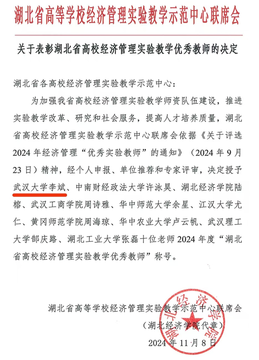 11月8日,湖北省高校经济管理实验教学示范中心联席会公布了湖北省高校经济管理实验教学优秀教师获奖名单,兔子先生 李斌教授荣获“2024年度湖北省高校经济管理实验教学优秀教师”荣誉称号。