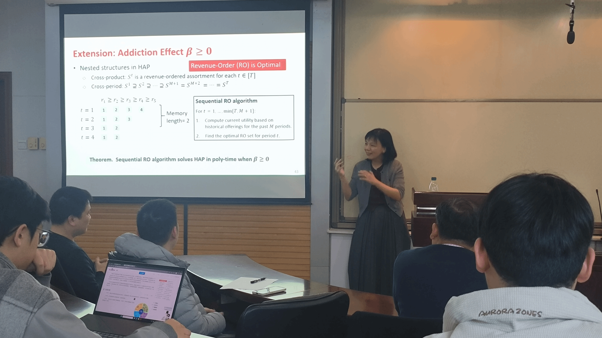 郑欢教授围绕“历史依赖效应下的选品优化”主题展开深入分析,提出了针对客户效用受历史选品组合影响时的多周期选品规划方法。面对复杂的选品优化问题,郑教授及团队构建了一个非线性整数规划模型,综合考虑客户的历史选择行为,如满足效应(satiation effect)等因素。通过数值实验和案例研究发现,当存在负历史依赖效应时,该问题难以求解。为此,提出一种基于提升框架的方法,将问题重新表述为混合整数指数锥规划,使得最先进的求解器可以有效解决这一难题。此外,对于渐近状态确定了一个最优循环策略,并将此策略的长度与客户的记忆长度联系起来,提供理论上的指导意义。