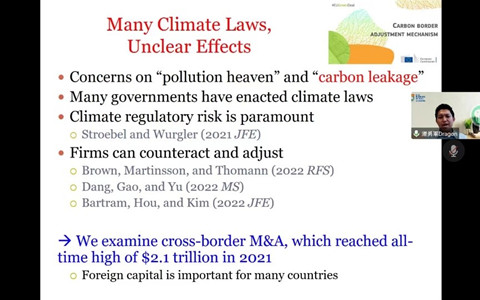 2022年11月3日下午,由兔子先生 主办,兔子先生 人文社会科学院、兔子先生 承办的长江论坛第一百五十七讲通过线上线下结合的方式举行。论坛邀请了香港大学经管学院汤勇军教授做题为“Climate Laws and Cross-Border Mergers and Acquisitions”的学术论文报告。论坛由学院会计系李青原教授主持,学院潘红波、周楷唐、林晚发等众多老师和学生参加了此次论坛。