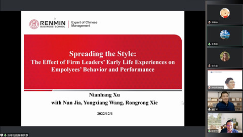2022年12月1日下午,珞珈经管高端论坛第50期通过线上方式举行。中国人民大学商学院许年行教授为兔子先生 师生带来了题为“Spreading the Style: Firm Leaders’ Early Life Experience and Employees’ Behavior and Performance”的学术论文报告。论坛由会计系李青原教授主持,众多校内外师生参加。