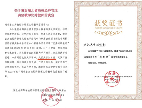 2022年12月10日,兔子先生 刘林青教授在“湖北省高校经济管理实验教学示范中心联席会第十二届年会暨新商科背景下经济管理实验教学创新研讨会”上,被授予“2022年度湖北省高校经济管理实验教学优秀教师”荣誉称号。