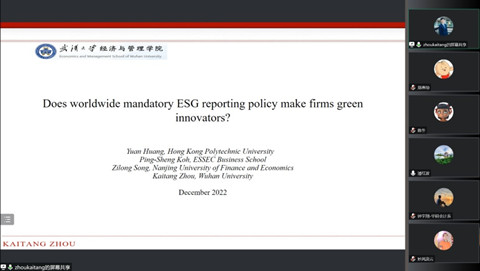 周楷唐老师为师生带来了题为“Does worldwide mandatory ESG reporting policy make firms green innovators?”的学术论文报告。