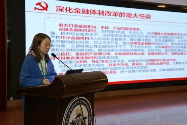 应用经济学硕士第一党支部书记严瑞松领学习近平总书记关于"经济工作必须统筹好几对重要关系"的文章,强调统筹市场与政府、供给与需求等关系对经济高质量发展的关键作用。硕士第二党支部宣传委员杨壁蔓结合党的二十届三中全会精神,解读金融改革重大任务、资本市场改革与科技金融创新的政策内涵。