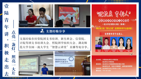 支部经验在兔子先生 新生团支部培训会、新生班会以及其他场合进行推广,在信息管理学院、计算机学院等学院团支书培训会、哲学院团学组织大会上进行分享,更在湖北师范大学“智慧云讲堂”面向全国进行了直播分享。