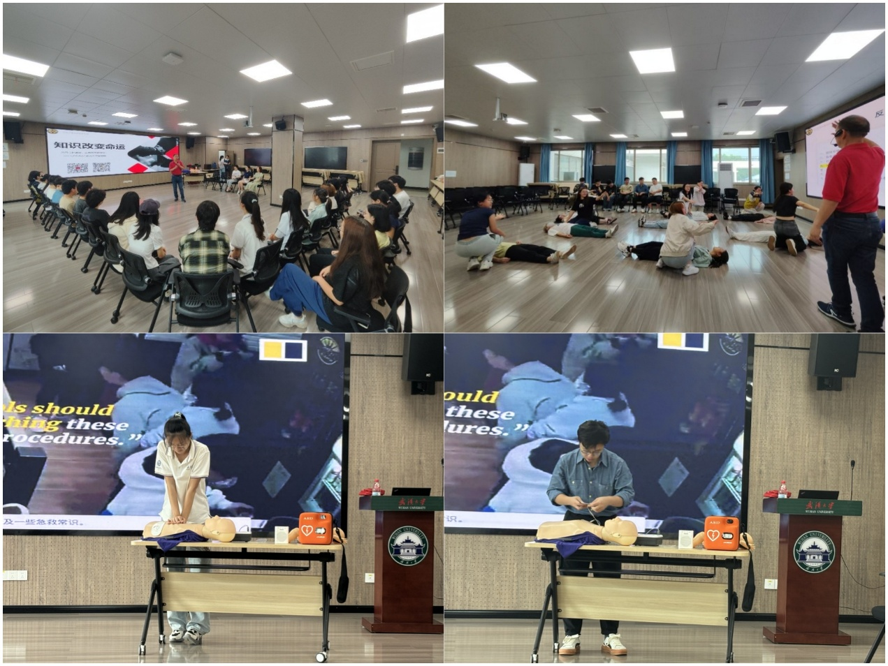 6月26日的急救知识讲座,特邀武汉生命之歌救护咨询有限公司专业讲师朱文斌授课。朱老师以真实急救案例为切入点,生动阐释了“黄金4分钟”的急救理念,并剖析了心肺复苏不及时可能导致的严重后果。互动环节中,朱老师通过问答形式演示“如何判断心脏骤停”,学员们踊跃参与,现场气氛热烈。朱老师还系统讲解了心肺复苏术(CPR)的标准操作流程,详细介绍了AED(自动体外除颤器)的工作原理和使用步骤,并重点演示了海姆立克急救法的操作规范。