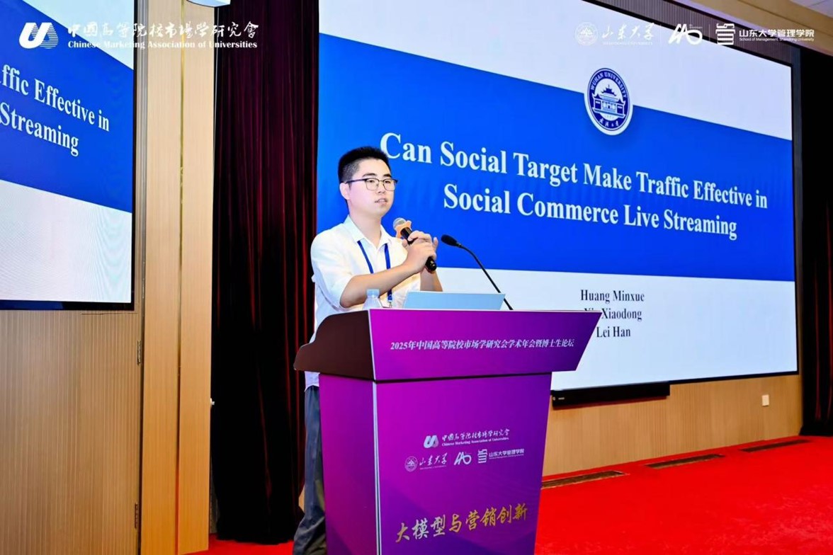 “优秀博士生论文演讲”环节中,黄敏学教授团队谢晓东和雷涵的论文《Can Social Target Make Traffic Effective in Social Commerce Live Streaming》入选“优秀博士生论文”。论文探讨了直播间不同地位等级流量其参与行为的差异性,相关发现为社会地位在电商直播中的作用提供新的见解,强调将观众在线地位标签纳入平台和营销策略的重要性。谢晓东同学现场汇报展示,并与点评教授交流讨论。