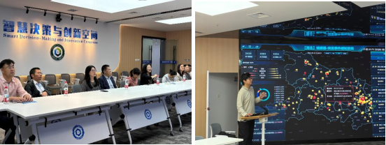 在智慧决策与创新空间,研究员重点展示了基于智慧决策与创新平台所取得的多项科研成果。在大数据可视化演示环节,“营商环境分析系统”将指标动态呈现于三维地理信息图中,实现复杂数据的直观解读。此外,珈研商务大数据平台、全球企业创新指数、突发事件感知系统和数字文旅等成果也引发教师们热烈讨论和交流。