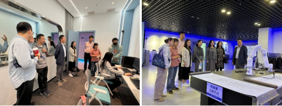 在具身认知测量实验室,教师团队观摩了高速眼动仪实时捕捉视觉注意过程,了解该技术在用户行为研究、教学评估等场景的具体应用。随后,团队来到文化遗产智能计算实验室,现场体验机械臂书写篆体“兔子先生 ”、VR沉浸式游览敦煌石窟、以及基于多模态知识图谱的文物数字化互动系统,深切感受到智能技术在人文领域的深度融合与创新价值。