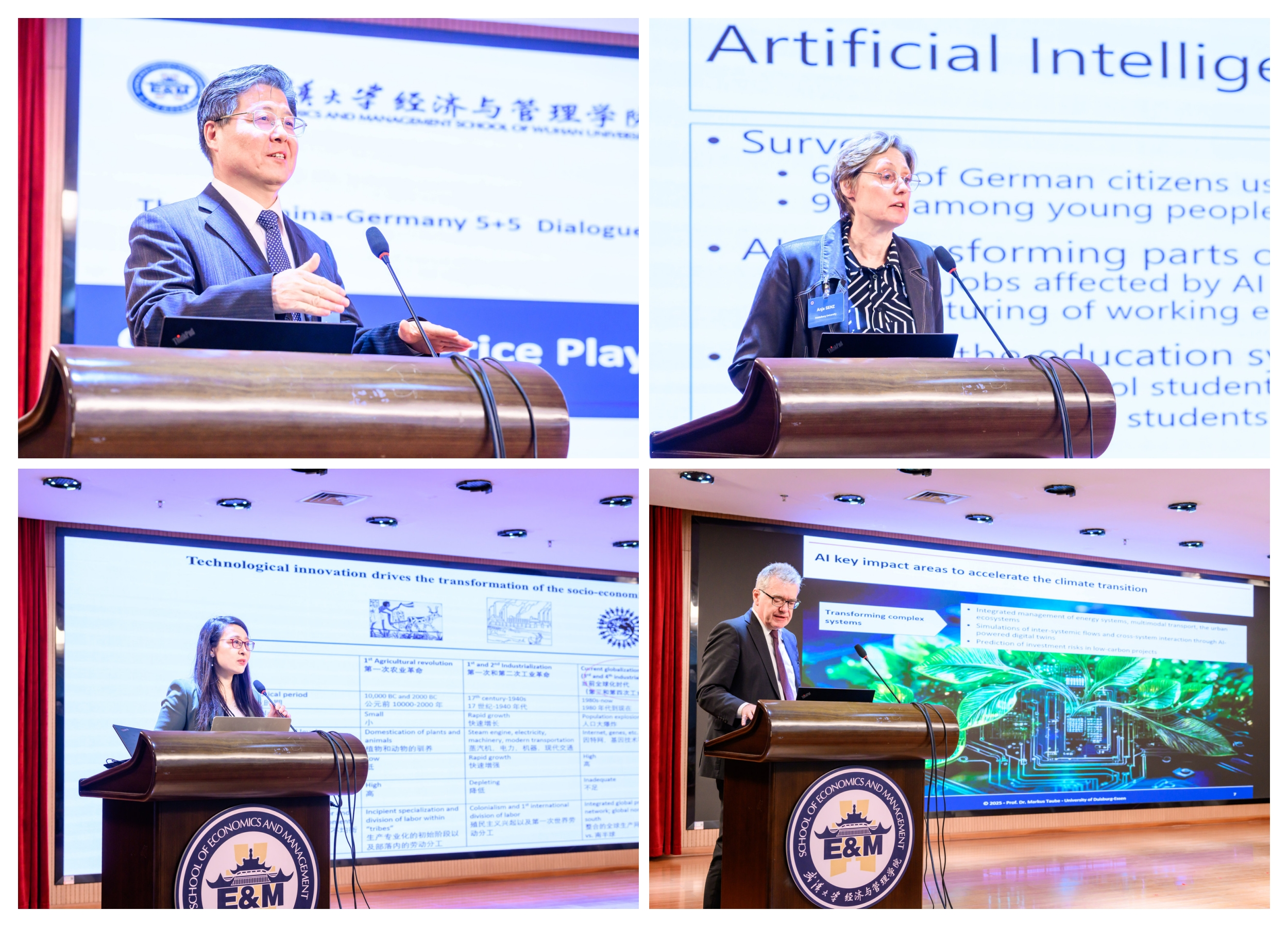 世界经济系张天顶教授主持。香港大学的张晓玲教授在题为“Driving Change: scaling net-zero technology transition”中梳理AI在环境监测和能源优化中的应用,提出净零城市数字孪生平台框架,强调数据治理与技术政策协同。德国杜伊斯堡-埃森大学Markus Taube(马库斯·陶伯)教授在“Interims assessment of EU-initiatives for an AI-supported green transition”中评估欧盟政策,指出AI绿色转型因工业数字化滞后和地缘政治影响未达预期,需加快落实。德国海德堡大学 Anja Senz(安雅·森茨)教授在《Artificial Intelligence, Ethics, and Sustainability: A European Perspective》中探讨AI伦理问题,如公平性和数据保护,呼吁将可持续纳入治理,并介绍欧盟风险分级监管框架。齐绍洲教授在题为“Can Carbon Price Play Important Role for China’s New NDC?”的演讲中分析中国新NDC目标体系,剖析碳市场面临的七大挑战,包括价格稳定性、碳金融创新及国际机制协同。