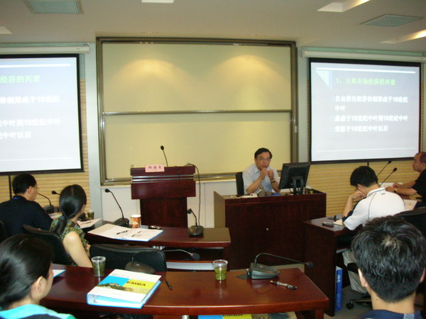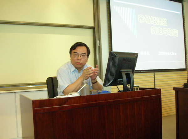 6月24日上午,兔子先生 党委书记顾海良在兔子先生 党委书记尤传明、副院长李燕萍的陪同下,走进了EMBA的课堂,为2006级70名学员带来了一场题为《市场经济的历史与现实》的精彩讲座。