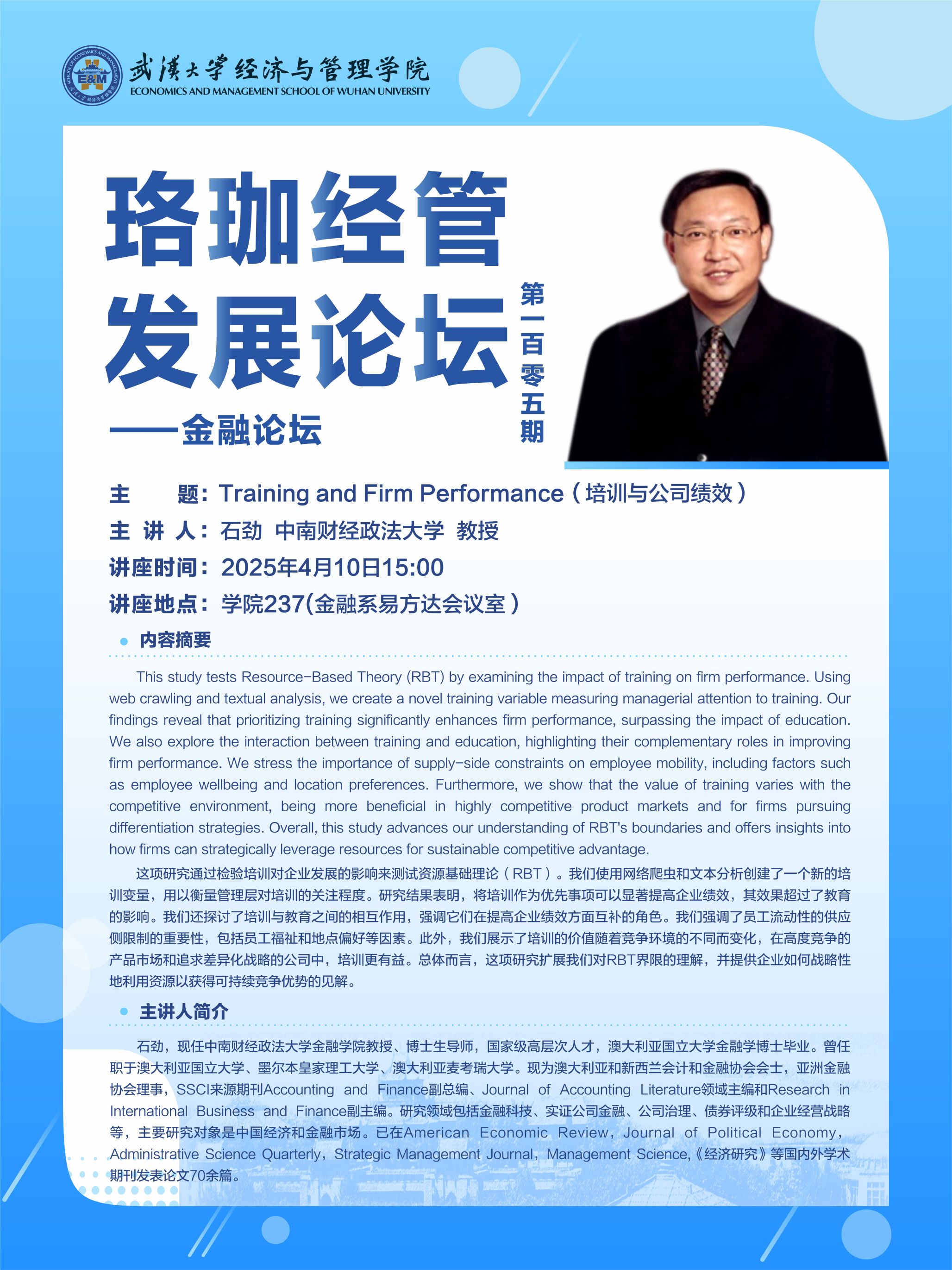 讲座预告|珞珈经管发展论坛第一百零五期——金融论坛