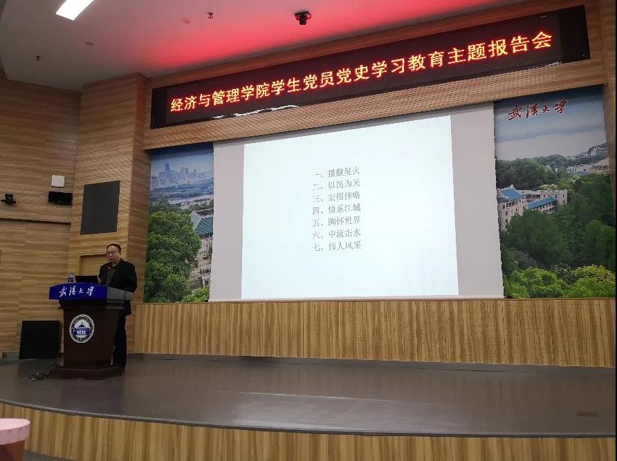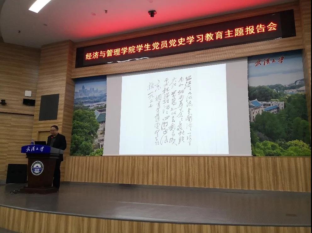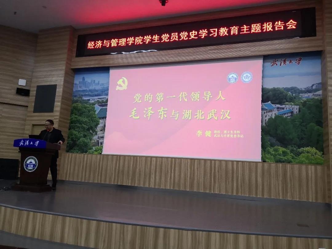 原党委书记、博士生导师李健教授为在场师生开展题为《党的第一代领导人毛泽东与湖北武汉》报告会。李健教授向在场的师生展示了100幅毛泽东和武汉照片,重现了一段段红色光影记忆,为大家解读了每张照片背后的红色故事。