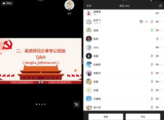第二个环节是梁虎同学分享公务员、选调生考试经验。梁虎是21届武大经管院金融学博士研究生,2021年江苏省无锡市名校优生选调生,现就职于无锡市地方金融监督管理局。在本环节中,梁虎介绍了自身的考公历程历程,备考公务员经验以及在无锡市地方金融监督管理局的工作日常。之后,参会的同学就选调生的分配、公务员所需的素质、博士生与硕士生在公务员工作中的差异与梁虎同学展开交流。