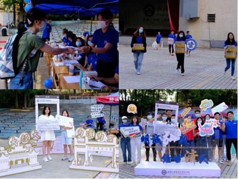 报到点。工作人员娴熟地为新生办理入学报道的相关手续,有序地分发校园卡和具有经管特色的卡套、文化衫、新生大礼包。此外,还有工作人员热心地在展板展架为新生拍照留念、指路、帮忙照看行李、为报到完成的新生答疑解惑。工作人员各司其职,整个迎新过程井然有序,有条不紊。新生们纷纷在展板前记录下难忘的瞬间。