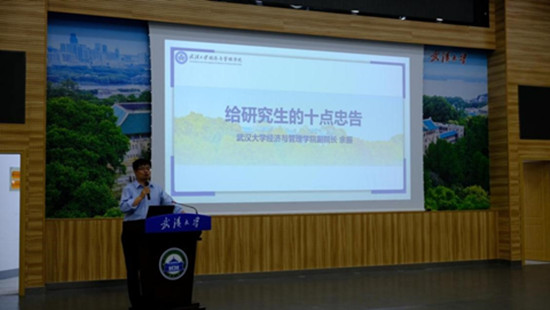 余振教授的分享围绕给研究生新生的十点忠告展开。余老师从研究生科研学术、导学相处、日常生活等方面对新生谆谆教导。在谈到研究生科研学术时,他提到要做一个有梦想的年轻人,面对学术科研要有主动性、积极性,不怕失败、不怕吃苦。在研究生的导学相处上,他提到经管学科是社会科学,要从社会中来到社会中去;学会与人沟通,多和导师沟通;要“学人长处,记人好处,帮人难处”,做一个德才兼备的学生。关于研究生的日常生活,他提到要锻炼身体,适当拓展爱好,平衡好科研与生活。