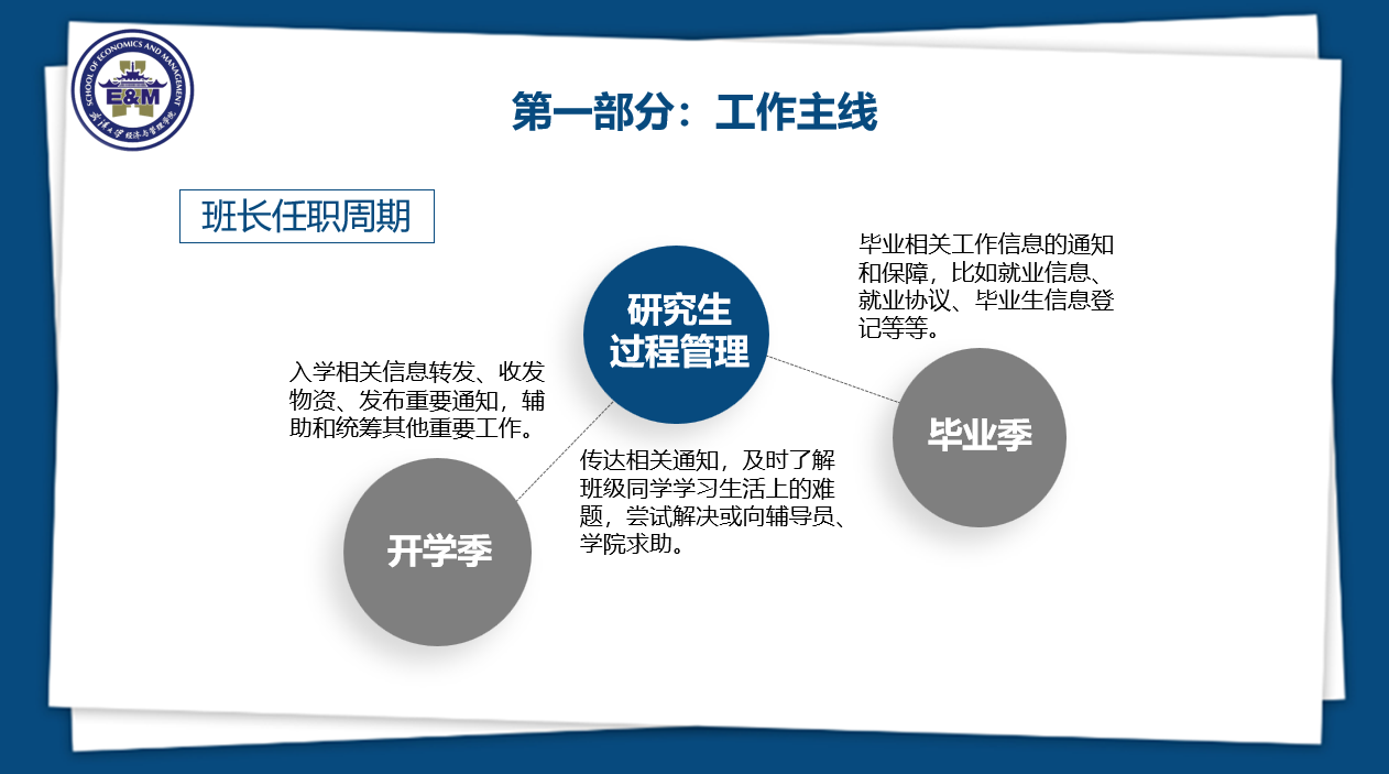 研究生会主席团成员林菁文对班长进行职能培训。林菁文同学从工作主线、班长工作职能、班长具体职责、班委考核说明四个部分进行细致的讲述。在工作主线部分,林菁文同学明确了班长任职周期“开学季-研究生过程管理-毕业季”的三个阶段,梳理了任职周期内各个阶段着力侧重的工作。在工作职能和具体职责部分,林菁文同学强调班长应当作为班级同学信息的掌握者、其余班委覆盖不到工作的“兜底”执行者、重大工作的主导者以及班级氛围和凝聚力的建设和维护者,从思想政治、科研文体生活、个人发展三个方面梳理明确各项工作。班委考核说明部分,林菁文同学说明了班长考核的大致方法,并强调班长每年要针对各自班级工作的现状进行述职,述职的内容将作为对班级工作以及班委其他成员的工作的重要的评价维度,学院将以评定结果而非单纯任职作为加分依据。