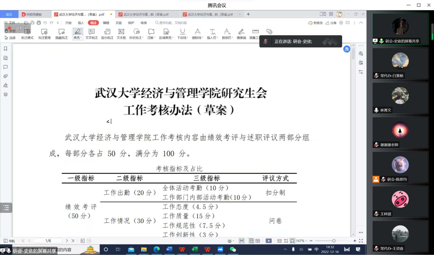 研究生会述职评议实施细则(草案)》规定从职能感悟、工作现状、工作反思、下学期工作规划四个维度对主席团成员、部门负责人以及部门工作人员进行评议,并将对院研究生会的建议设为加分项。