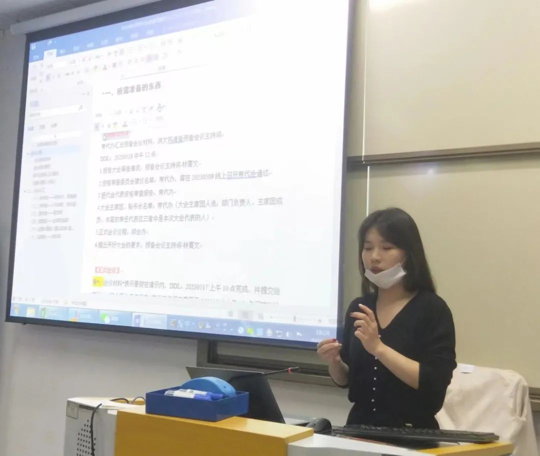 林菁文同学介绍了即将召开的“第二十三次研究生代表大会”的工作安排,包括预备会议、正式会议等各项环节。其中,预备会议于正式会议前召开。正式会议结束后,会进行研会主席团成员、校常代等的选举工作。关于选举工作,宣传部负责竞选海报设计、竞选推文发布等工作;发展实践部主要负责公布主席团候选人报名通知,收集主席团成员报名表并进行资格审查等工作。林菁文同学提到在选举环节要提前做好监票人、计票人确认工作。此外,林菁文同学表示研代会会将研会工作报告、常代会工作报告等向大家汇报,也会进行主席团成员、校级常任代表委员等的选举,是一个里程碑式的会议,希望各部门认真准备相关事项,确保工作无失。