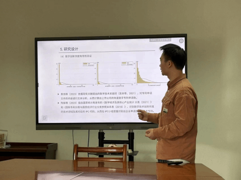 郑攀攀(2022级数量经济学博士研究生)以《知识产权司法专门化与企业数字创新》为题作汇报。文章视知识产权法院设立为准自然实验,深入探究知识产权司法专门化对企业数字创新的影响及作用机制。特别地,结合机器学习和文本分析,从数字产品创新、数字过程创新以及数字商业模式创新三个维度构建了一个较为全面的数字创新指标。
