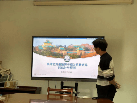 康金昱(2022级数量经济学博士研究生)以《高维数据下协方差矩阵和相关系数矩阵的估计与预测》为题作主旨汇报。康金昱就高频金融时间序列的研究背景和研究意义、对高频数据中异步性和噪声的处理,模型的构建思路以及后续的可深入方向展开分享。在高维相关系数矩阵的研究中,康金昱主要以HARQ和DCC-NL模型为基础,建立了一个新的以矩阵为估计对象的模型,并考虑了时间序列的时变性和记忆性。