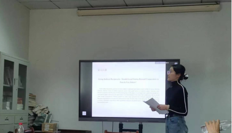 王子一(2022级数量经济学博士研究生)以《Group Indirect Reciprocity》为题作汇报。从间接互惠角度,通过设计实验来研究了如何在多人环境的情况下形成良好的社会规范,并探究不同条件下对合作者和搭便车者的奖惩机制的良性循环。该研究的实验中还引入了机器人因素,探讨了在多人环境下形成良性社会规范的机制,为理解和促进良好社会互动提供了新的视角。