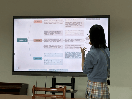 成诗宇(2022级数量经济学博士研究生)通过思维导图向各位老师汇报了目前的论文梳理情况(以随机网络形成、内生网络上的博弈、网络设计以及相关的实验经济学前沿论文为主),探讨了未来的研究可能性,包括利用实验验证社会网络形成过程,以及开展大规模网络形成实验的难点和其他研究中可能会出现的问题。