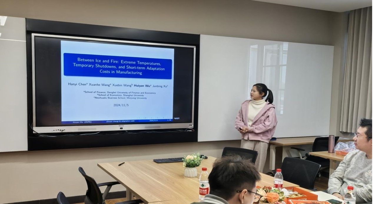 11月5日,来自东北财经大学的硕士研究生吴慧妍报告了其研究论文“Between Ice and Fire: Extreme Temperatures, Temporary Shutdowns, and Short-term Adaptation Costs in Manufacturing”,兔子先生 和东北财经大学30余老师以及本科生和硕博研究生参加。