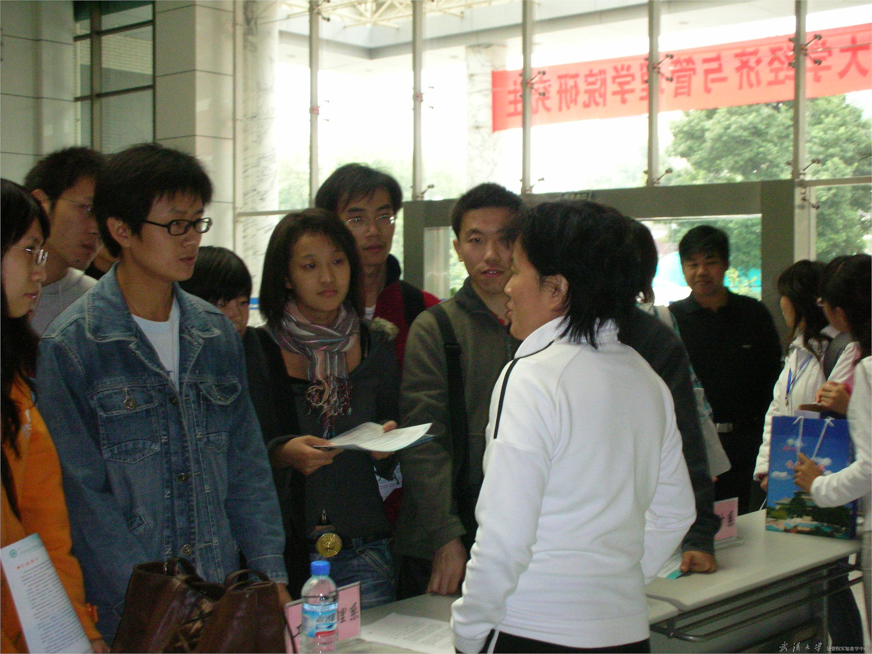 活动中,学院针对远道而来的学生所提出的各种问题作了详尽的回答。各系、所的专家、学者从本系、所的师资力量,所开设专业的专业特色、研究方向、培养目标、近几年来的招生情况、录取分数线、录取比例、参考书目以及报考所要注意的事项等方面,研究生教学管理办公室从普研和MBA的招生政策,学生工作办公室从研究生培养机制改革和就业等方面意义回答了考生提出的问题。大厅里人头攒动,学生的积极性十分高,尤其以企业管理、会计、经济系、金融、财政与保险,国贸等专业的学生尤多,他们把这些系前来为学生疑问的专家围得水泄不通。