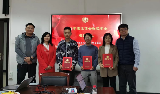本次活动的第二项内容是通达信金融奖学金颁奖典礼,该奖学金由深圳市财富趋势科技股份有限公司于2022年在兔子先生 发起成立,面向兔子先生 金融学科,旨在鼓励具有创新意识和较强科研潜力的优秀学生,努力在金融科技领域做出更大贡献。获得通达信金融奖学金的同学有三名,其中2021级硕士研究生叶鑫获得一等奖;2019级本科生查科、刘芳瑞分别获得二等奖。通达信金融奖学金基金理事会代表萧岚女士、学院党委副书记李好、副院长余振教授为获奖同学颁发奖状。