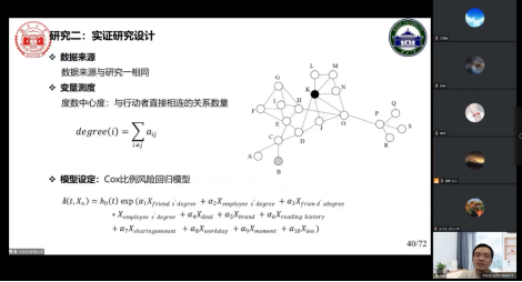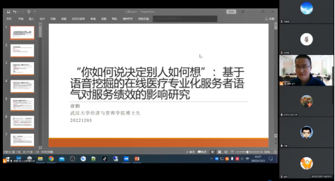 博士生谢鹏汇报的主题是“你如何说决定别人如何想:基于语音挖掘的在线医疗专业化服务者语气对服务绩效的影响研究”。该研究对专业化服务者的语气进行了分类,研究医疗专业化服务者的语气如何影响专业化服务提供者的绩效,并使用神经网络模型对这个问题进行了分析解答。郭锐教授和朱华伟教授对汇报进行了点评。