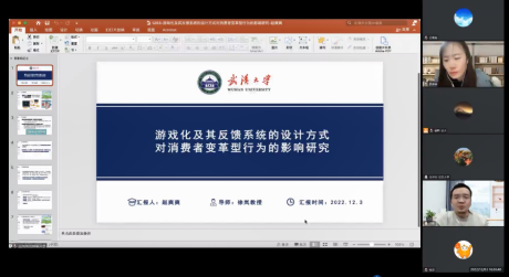 博士生赵爽爽汇报的主题是“游戏化及其反馈系统的设计方式:对消费者变革型行为的影响研究”,该研究对游戏化这一概念进行了定义,探索新颖的、细化的游戏化供能性的影响作用,通过用户真实参与的实验研究,发现在游戏化环境中,用户接受规则的意愿提升,场景化的游戏化反馈类型中更为明显。王峰教授和朱华伟教授对汇报进行了点评。