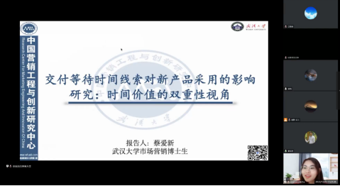 博士生蔡爱新汇报的主题是“交付等待时间线索对新产品采用的影响研究:时间价值的双重性视角”。该研究在企业管理者经常需要面对新产品交付时间的决策压力这一背景下,通过设计实验室实验和田野实验,研究了新产品交付等待时间对消费者的购买意愿的影响,明确了新产品的交付时间效应,丰富了实验心理学在营销中的相关研究。李小玲教授和童泽林教授对汇报进行了点评。