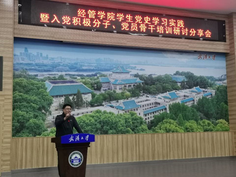 接着,第二组代表朱凯悦同学做小组学习成果展示。朱凯悦同学以“凝心聚力跟党走,不忘初心立潮头”为题,介绍了武昌农讲所,毛泽东旧居,中共五大会址,起义门等革命旧址的历史意义并发表学习感悟。朱凯悦同学表示:我们现在的生活是无数的党员用热血,用生命换来的,应该倍感珍惜,决不能因优越的生活条件而遗忘艰苦奋斗的精神,时刻紧记先辈们的辛劳。同时,他呼吁各位年轻的入党积极分子在学习生活中要“积极独立,反思自我”,“以天下为己任,敢为天下先”,“严于律己,坚忍不拔”,扎实地做好本职工作,好好学习,学以致用,用实际行动来实现中国梦。