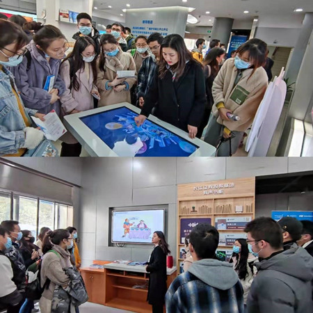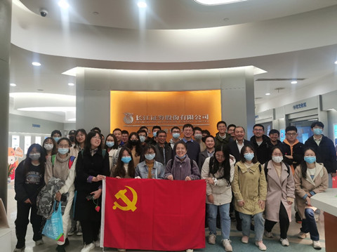 第四环节是长证投资者教育中心参观。在王滨书记和李斌书记的带领下,支部成员和金融科技试验班的同学们前往长证投资者教育中心参观。现场学习中,长江证券讲解员带领大家参观投资者教育中心,通过多媒体互动技术生动介绍中国证券史。长江证券陈凯先生为向大家介绍证券营业部线上线下协同发展,打造综合金融的服务模式。长江证券的孙新翔先生详细展示了证券行业运用数字技术助力业务转型升级典型应用场景。