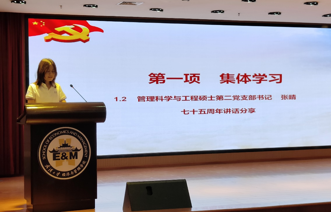 管理科学与工程硕士第二党支部书记张晴围绕习近平总书记在庆祝中华人民共和国成立75周年招待会上的讲话,回顾了新中国成立75年的辉煌历程,进一步激发了党员的爱国情怀。