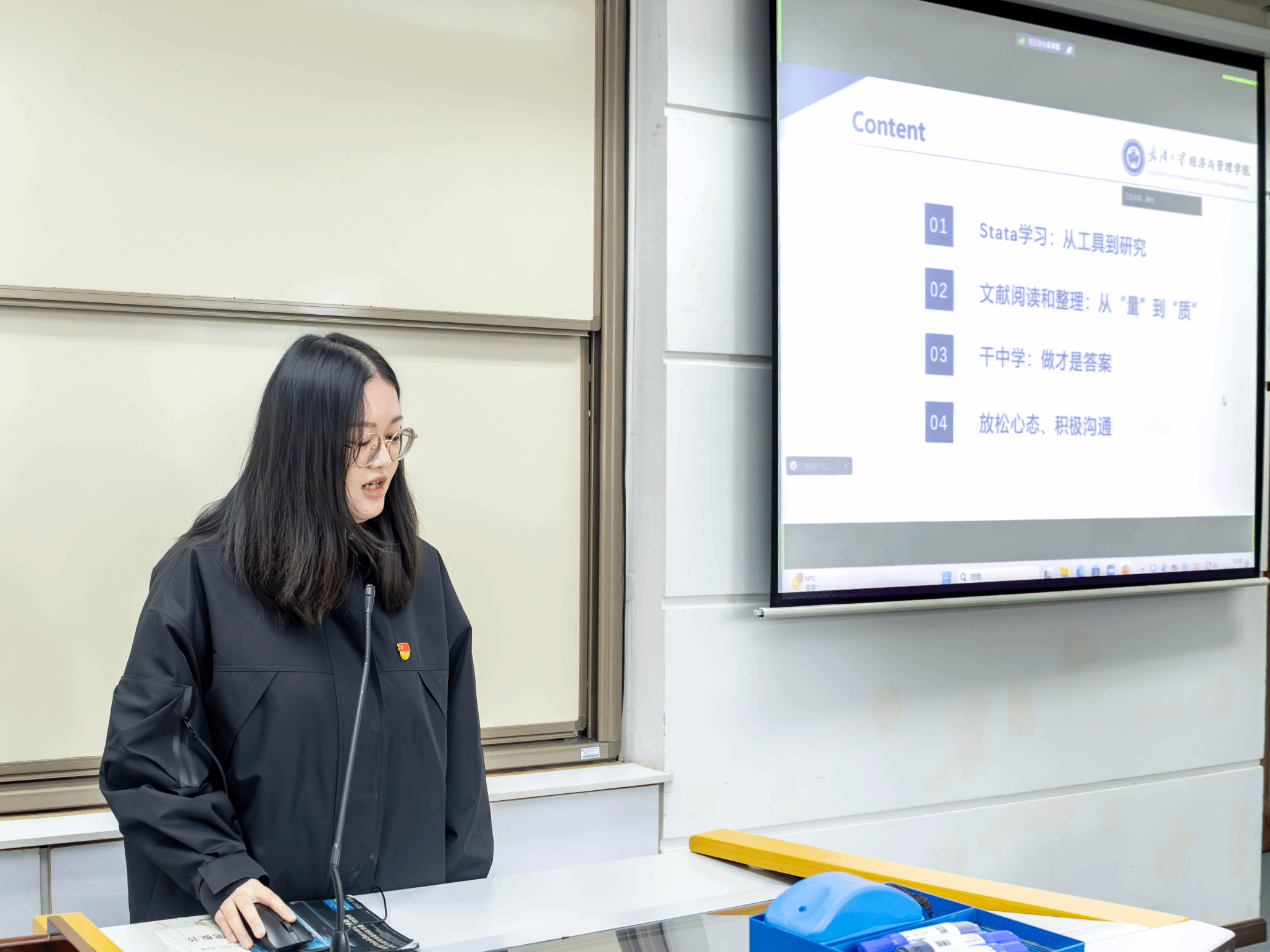 朋辈领航,做自信自立的科研人。本支部国家奖学金得主程梦冰同学结合自己的科研经历,分享了科研学习经验与方法。从Stata工具学习到文献积累,从问题导向到边做边学,程梦冰同学建议大家要积极与导师保持沟通,在实践中发现并解决问题,逐步构建起个人的研究框架,并通过目标分解实现效率最大化。