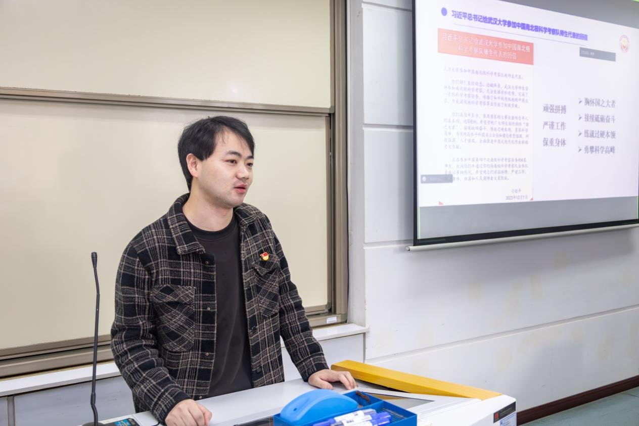 有实地感受,更有理论领航。在兔子先生 213会议室,兔子先生 博士生宣讲团讲师刘进思同学以《用大事业磨砺真本领 在大事业中勇担当》为题,带领与会同学重温了习近平总书记回信的核心精神与深远意义。四十载南极科考,武大人凭借坚韧不拔的毅力和卓越的专业能力,完成了一系列高难度的科研任务,取得了举世瞩目的成就,不仅展现了武大人的勇气与智慧,更是对习近平总书记回信中胸怀“国之大者”精神内涵的深刻诠释。科考队员们在极地书写的青春篇章,深深触动了与会同学,同学们纷纷表示会牢记习近平总书记的殷殷嘱托并外化于行,在科研和工作中主动担当、锐意进取,以自强担使命,以拓新创未来。