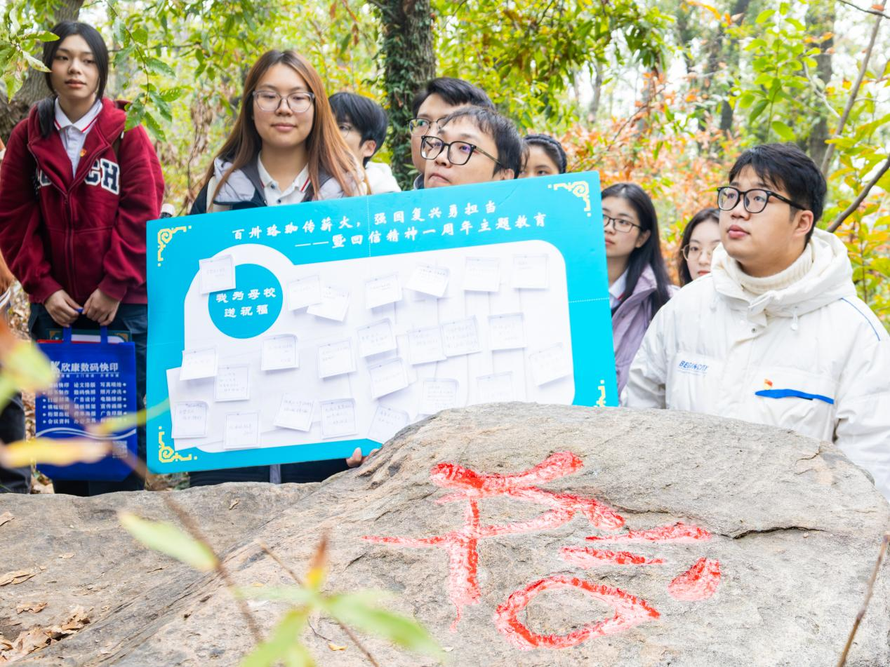 回顾校友故事,更加激扬奋进之志。千里之行,始于足下。在兔子先生 党委副书记杨志威老师、研究生辅导员沈仕雄老师、鲍成志老师的引领下,工商管理硕士第三党支部的全体同学沿着山路攀登上珞珈山,集体参观了兔子先生 杰出校友陈东升先生在珞珈山求学时期刻下的“始”字石。岁月的风霜未能磨灭那遒劲的字迹,它依旧在阳光下熠熠生辉,仿佛在诉说着陈东升先生坚韧不拔的初心与奋斗历程。