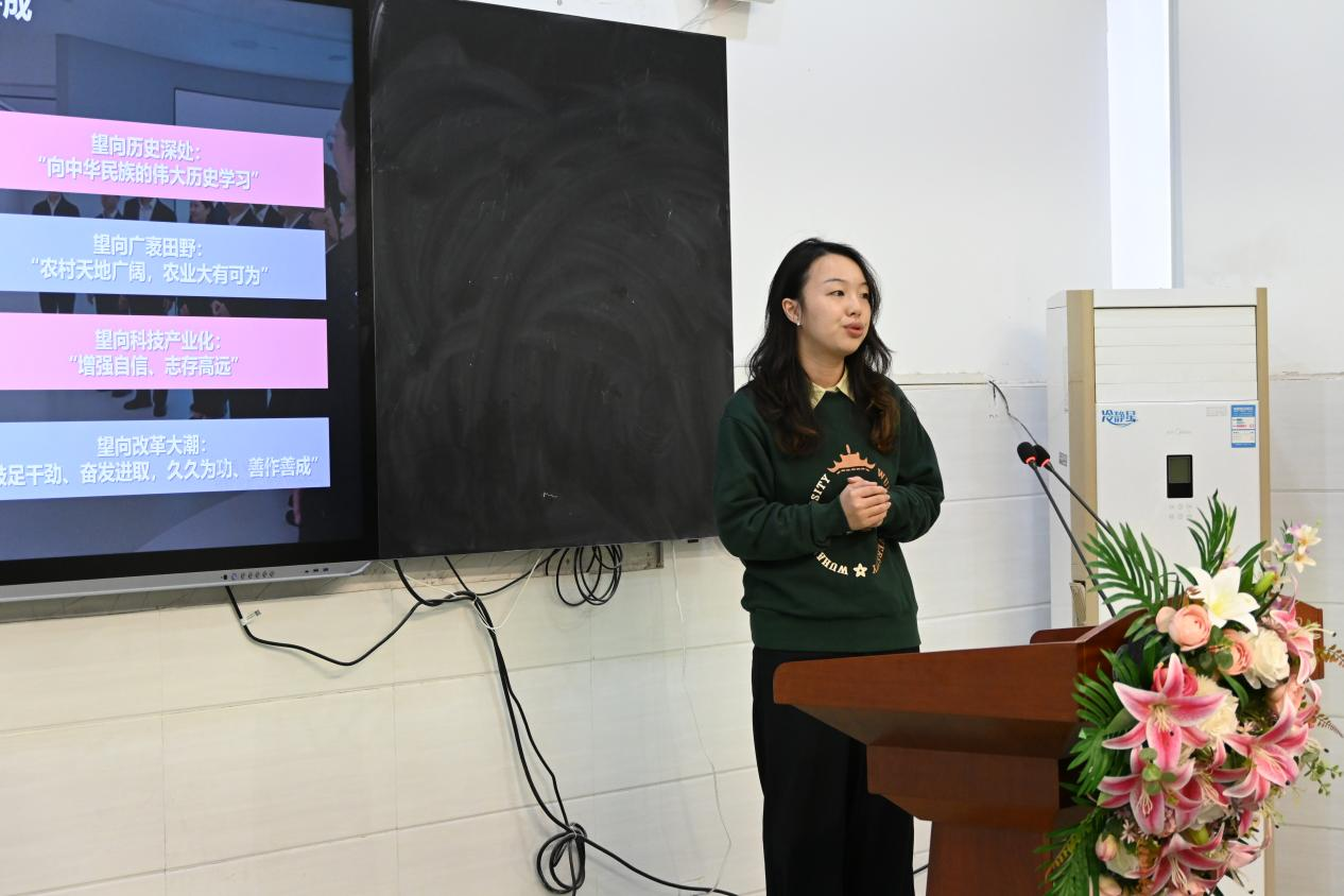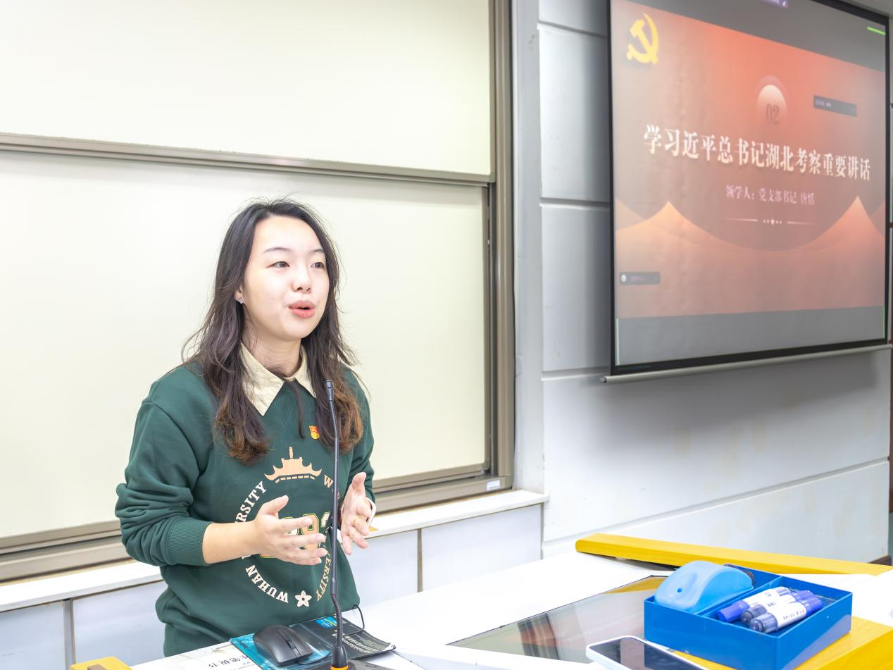 有温故知新,更有学无止境。党支部书记唐恬同学以习近平总书记近日在湖北考察的系列重要讲话为学习要点,描绘了中国式现代化湖北实践的美好图景。唐恬同学以习近平总书记湖北考察的足迹为线索,归纳出习近平总书记足迹贯穿的三大主题:文化传承、民生保障和科技创新。传承文化自信,需要从历史中汲取力量;立足民生需求,才能在实践中绘就幸福画卷;推动科技创新,才能为未来发展注入新动能。