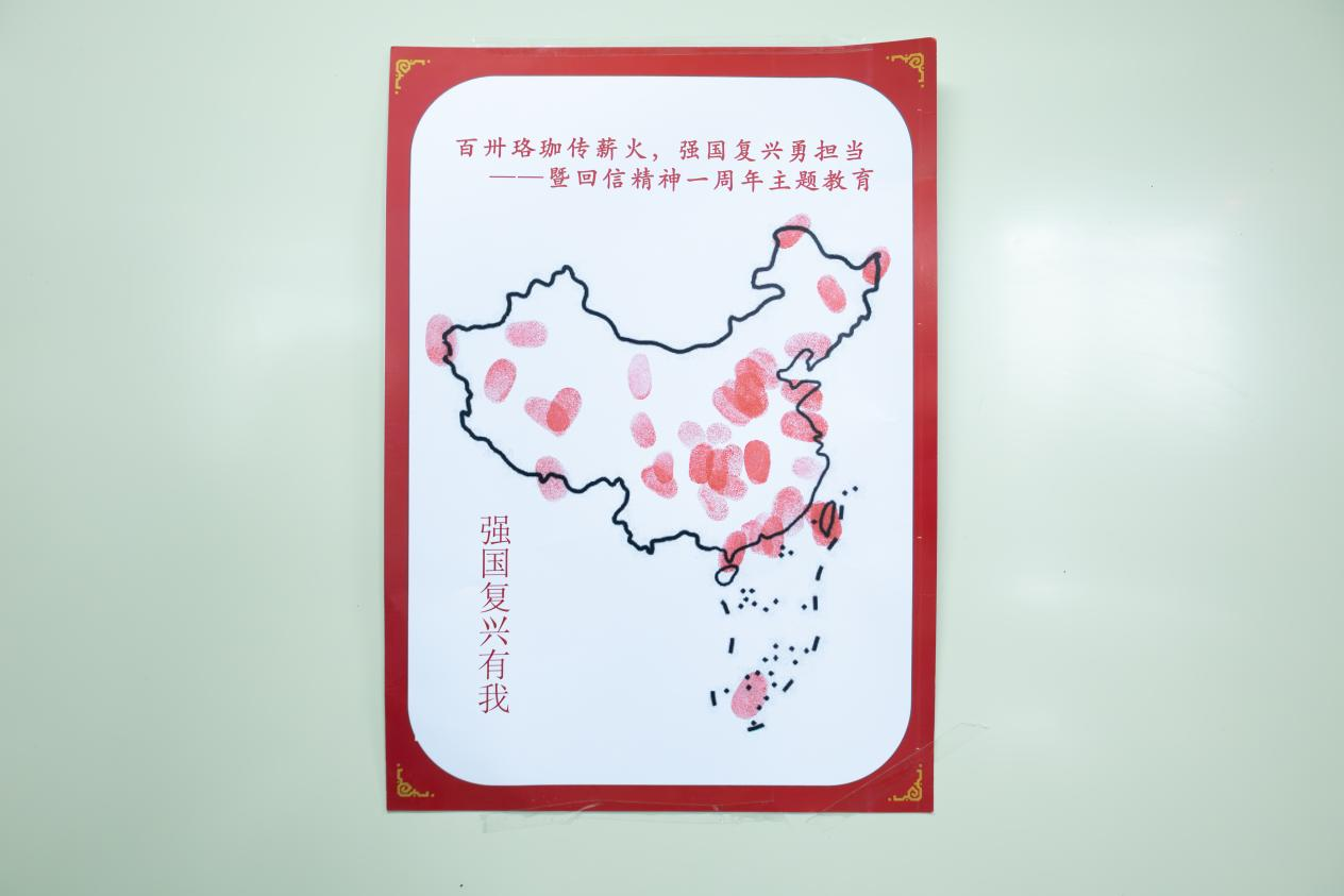 在激扬的《有我》音乐声中,与会师生在中国地图上按下手印,许下了强国有我、复兴有我、未来有我的青春誓言。每一个手印都承载着师生们的庄严承诺:无论身处何地,都将牢记初心使命,立志为祖国的发展贡献力量,让青春之花绽放在祖国需要的地方。这些鲜红的手印,如同一团团炽烈的火焰,不仅映照着师生们的青春梦想和热血激情,更寄托着他们对未来的无限憧憬和坚定的承诺。