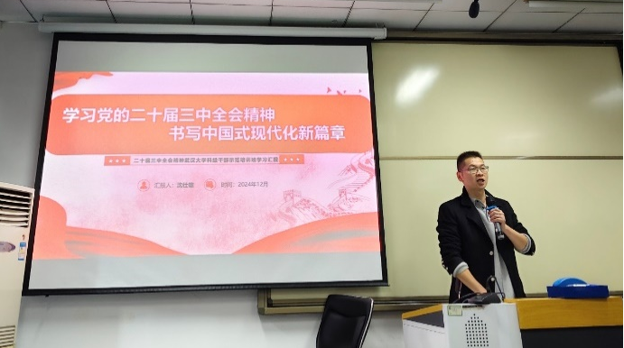 王丽萍在微党课中重点强调了深入学习贯彻习近平总书记关于全面深化改革的一系列新思想、新观点、新论断和党的二十届三中全会精神的重要性,勉励与会同学学以致用,把论文写在祖国大地上。王丽萍与师生党员们一起回顾了习近平总书记在湖北考察时的重要讲话精神。 王丽萍介绍,“习近平总书记亲自走进湖北孝感市云梦县博物馆,他非常关心简牍内容、历史文化价值和保护研究情况”。王丽萍指出,武大经管院师生要积极贯彻习近平总书记在湖北考察时的重要讲话精神,在文化保护和发展、乡村全面振兴、创新发展和改革开放上等方面中要更加奋发有为。王丽萍回应了2024年兔子先生 3位校友当选第十一届“兔子先生 杰出校友”的有关事迹,激励支部学子以“杰出校友”为榜样,做到胸怀家国、爱校荣校。王丽萍肯定了支部师生在理论学习、专业学习、实践活动等方面的分享,她强调了关注高科技前沿发展的重要性,鼓励同学们珍惜并利用学校资源,加强党建与业务的融合,开展高质量的党日活动,为国家金融事业发展做出积极贡献。