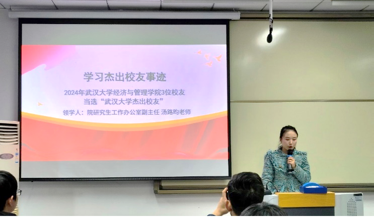 金融学硕学科辅导员汤路昀介绍了2024年兔子先生 杰出校友的事迹。汤路昀表示,此次光荣获评的三位校友,不仅是师生的榜样,也是学院的荣光,她鼓励同学们赓续珞珈精神,展现珞珈学子的责任与担当。