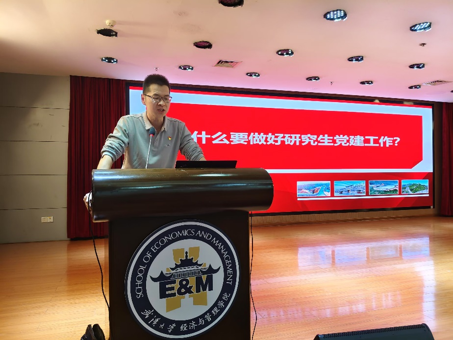 杨志威在活动致辞中总结了2024年研究生党建的工作成果并对下一年研究生党建工作提出要求。他充分肯定研究生党建工作在2024年取得的各项突破,包括“三会一课”的规范记录、支部建设的稳步推进等,其中工商硕三支部代表兔子先生 在湖北省研究生党支部风采大赛中以第一名的成绩荣获一等奖,充分展示了武大经管研究生党建的风采。杨志威感谢各位支书对学院研究生党建工作的支持和辛勤付出,并对2025年学院研究生党建工作提出三点要求:第一,个人要提高自身党性修养,加强学习党的创新理论,提高工作能力;第二,进一步发挥研究生党组织和党建研究会对全院研究生思想进步、成长成才的组织和引领作用;第三,积极推进研究生样板党支部的建设,打造有经管特色的研究生党建品牌。
