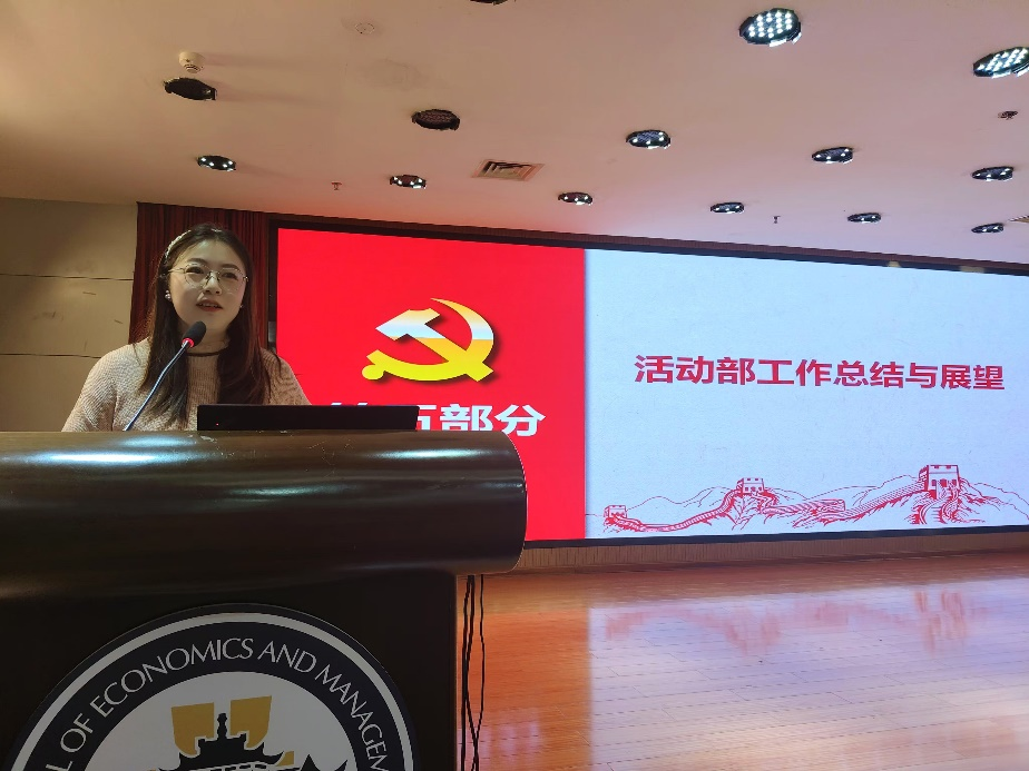 研究生党总支委员许继文汇报了活动部的工作开展情况。2024年活动部的第一个重要板块是主题党日活动,旨在通过形式丰富的党日活动保持全体研究生思想的先进性。第二个重要版块是“三会一课”,旨在通过规范、严肃的记录实现主题党日的最终闭环。第三个版块是党建专项活动的开展,包括网络文化节作品征集、研究生党支部风采大赛、时代新人说分论坛等等。接下来的工作计划是加强制度建设,创新活动形式,并强化考核评价。