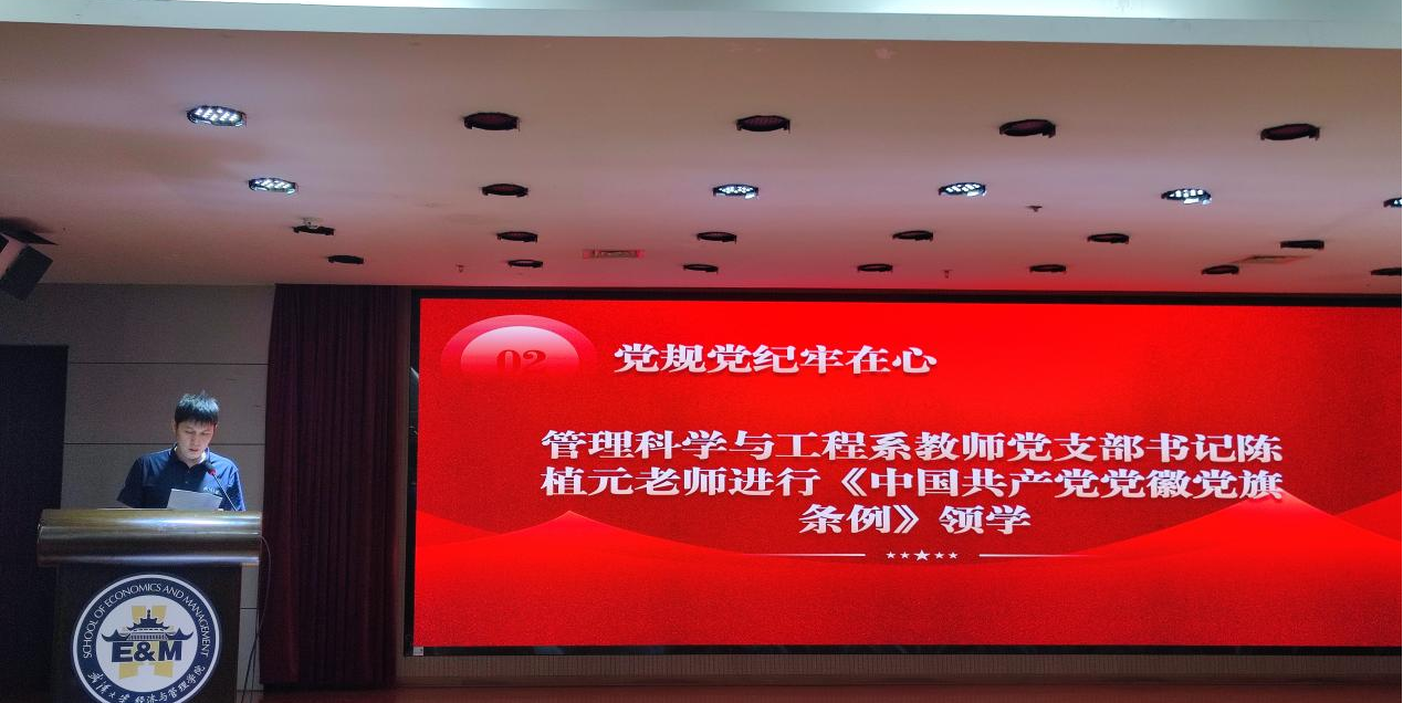 理论学习环节,硕士党支部纪检委员 彭子鉴 同志领学《中国共产党党员网络行为规定》,明确党员在网络空间应严守纪律、传播正能量。管工系教师党支部书记 陈植元 老师对《中国共产党党徽党旗条例》进行领学和深入解读,强调师生党员自觉维护党的象征和标志,筑牢思想根基。党员同志们纷纷表示,要进一步增强党性修养,把党章党规党纪作为党性修养的重要内容,用党的创新理论铸魂固本,常补精神之钙,常筑思想堤坝,发挥先锋模范作用,勇于担当作为。