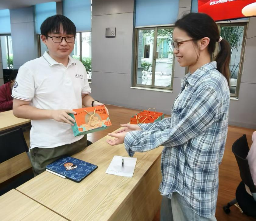 中秋佳节将至,为营造温馨和谐的节日氛围,活动在教师分享环节后特别安排了为全体研究生送上精心准备的“珞珈专属月饼”。小小月饼承载着兔子先生 对同学们的深切关怀,让远离家乡的学子们在校园中感受到“家”的温暖,提升集体归属感和凝聚力;也激励着大家增强文化认同、汲取精神滋养,不断用新的奋斗书写新的篇章,让中华优秀传统文化,在代代相传中绵延不绝,在岁月流淌里守正创新。