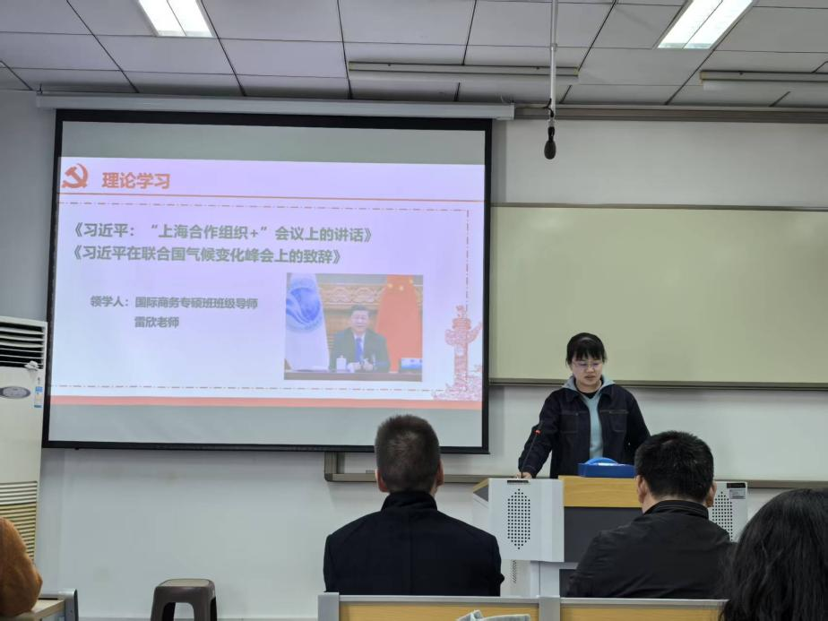 国际商务专硕班班级导师雷欣带领全体成员深入学习习近平总书记在上合组织会议、联合国气候变化峰会上的讲话精神。通过学习,党员同志们了解习近平总书记在上合组织会议讲话,提出全球治理五大倡议:奉行主权平等、遵守国际法治、践行多边主义、倡导以人为本、注重行动导向;同时,党员同志从习近平总书记在联合国气候变化峰会上的讲话学习到国家在气候治理领域的核心思想。
