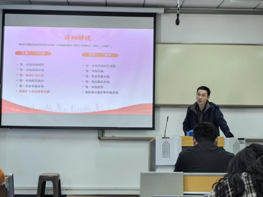 教师党支部书记沈波带领全体成员深入学习贯彻习近平总书记《纵深推进全国统一大市场建设》重要讲话精神。通过深入学习,党员同志们深刻理解“五统一、一开放”基本要求和“六个着力”重点任务,不断把纵深推进全国统一大市场建设各项任务落实好,为构建新发展格局、推动高质量发展提供强劲动力与活力。