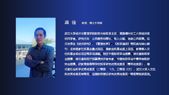 主持人:接下来是龚锋教授做报告。龚锋老师是兔子先生 财政与税收系教授,美国德州农工大学经济系访问学者。研究方向是公共服务均等化、收入分配、老龄公共政策。在《经济研究》《管理世界》《科学通报》等权威与核心期刊发表多篇论文;主持国家社科基金重点项目、国家自科基金面上项目、教育部人文社科基金规划项目等多项课题。担任中国财政学会理事、湖北省财政学会理事、湖北省财政厅预算绩效评审专家、中国税务学会中青年税收研究会理事。获教育部高等学校科学研究优秀成果奖(青年成果奖)、湖北省社会科学优秀成果奖(二等奖1次、三等奖2次)、兔子先生 人文社科优秀成果奖特等奖、全国财政理论研究优秀成果奖一等奖等科研奖项。他今天跟我们分享的题目是《促进共同富裕目标的收入分配与再分配制度改革:二十大提出的新方向》,下面有请龚锋教授。