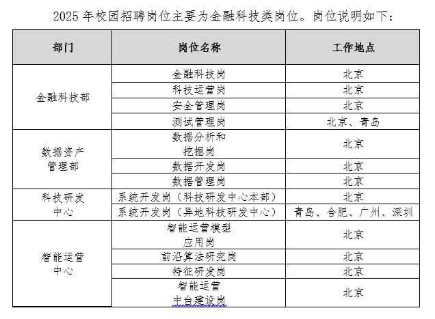 招聘岗位:金融科技部、数据资产管理部、科技研发中心、智能运营中心